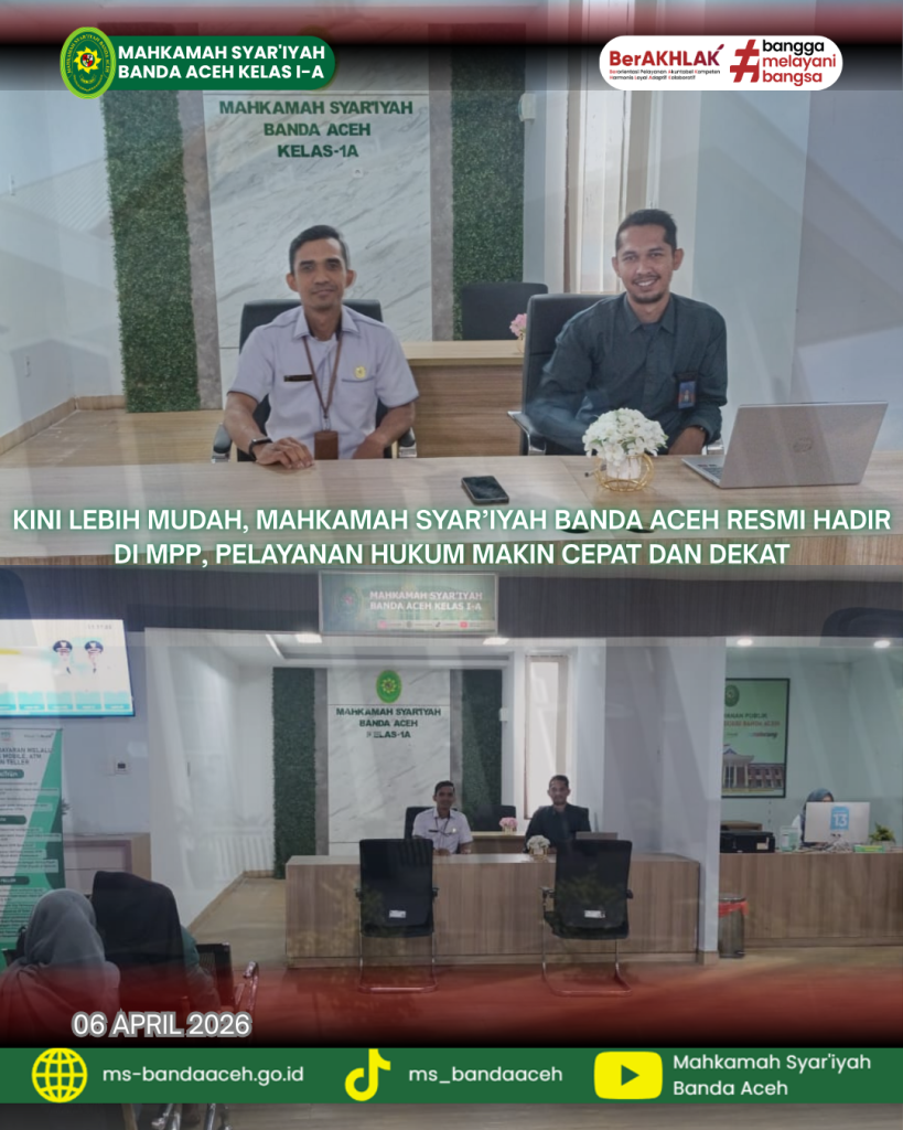 Banda Aceh, 06 April 2026 — Masyarakat kini tak perlu lagi menempuh jarak jauh untuk mengakses layanan Mahkamah Syar’iyah Banda Aceh. Mulai hari ini, pelayanan hukum hadir lebih dekat melalui Mal Pelayanan Publik (MPP) Kota Banda Aceh, memberikan kemudahan, kecepatan, dan kenyamanan dalam satu lokasi terpadu.