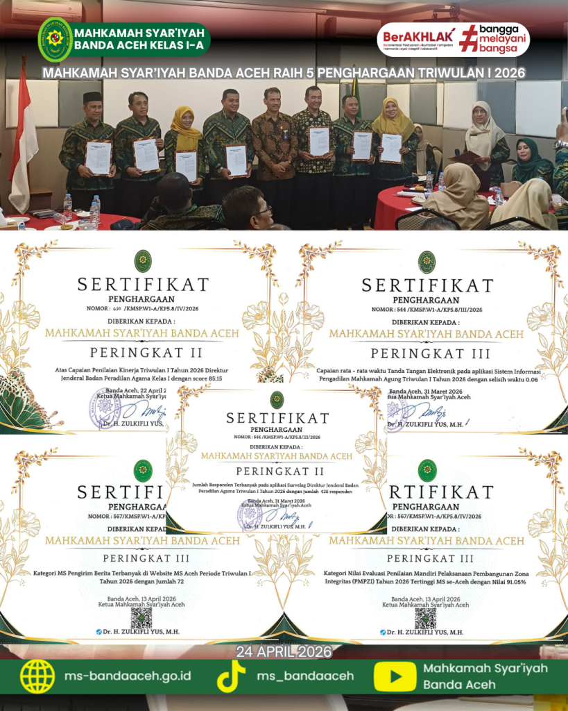 Banda Aceh, 24 April 2026 — Mahkamah Syar’iyah Banda Aceh kembali menorehkan prestasi membanggakan dengan meraih lima penghargaan dari Mahkamah Syar’iyah Aceh pada Triwulan I Tahun 2026. Capaian ini merupakan hasil dari arahan pimpinan serta kerja sama yang solid seluruh jajaran dalam meningkatkan kualitas pelayanan dan kinerja lembaga.