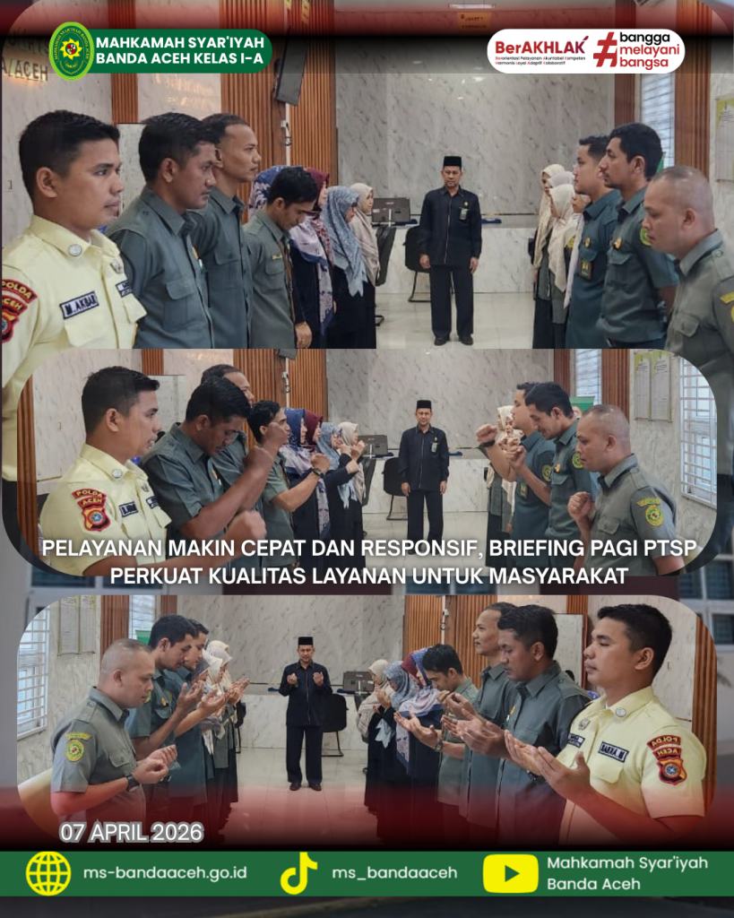 Banda Aceh, Selasa 7 April 2026 — Mahkamah Syar’iyah Banda Aceh terus berupaya menghadirkan pelayanan yang cepat, mudah, dan responsif bagi masyarakat. Melalui briefing pagi di ruang Pelayanan Terpadu Satu Pintu (PTSP), kualitas layanan diperkuat agar setiap pencari keadilan merasakan pelayanan yang lebih optimal dan memuaskan.