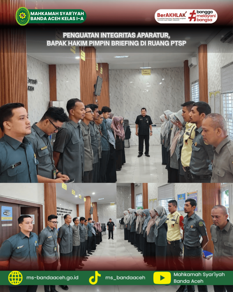 Banda Aceh, 21 April 2026 — Dalam rangka memperkuat komitmen terhadap integritas dan kualitas pelayanan, Mahkamah Syar’iyah Banda Aceh menggelar briefing pagi rutin bagi aparatur Pelayanan Terpadu Satu Pintu (PTSP) yang berlangsung di ruang PTSP. Kegiatan ini dipimpin oleh Bapak Drs. Said Safnizar, M.H., selaku Pembina.