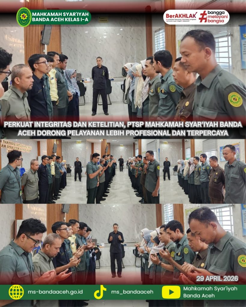 Banda Aceh, 29 April 2026 — Upaya peningkatan kualitas pelayanan publik kembali diperkuat oleh Mahkamah Syar’iyah Banda Aceh melalui briefing pagi di ruang Pelayanan Terpadu Satu Pintu (PTSP). Kegiatan ini menjadi langkah nyata dalam memastikan masyarakat memperoleh layanan hukum yang cepat, tepat, dan berintegritas, mengingat PTSP merupakan wajah utama lembaga peradilan di mata publik.