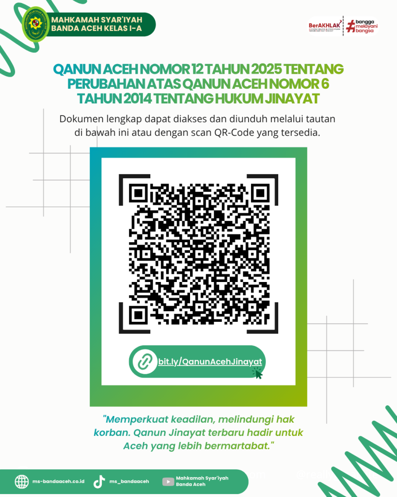 Akses Dokumen Lengkap Sebagai bentuk transparansi publik, Mahkamah Syar’iyah Banda Aceh menyediakan akses bagi masyarakat yang ingin mempelajari dokumen lengkap Qanun Aceh Nomor 12 Tahun 2025. Dokumen tersebut dapat diunduh melalui tautan resmi bit.ly/QanunAcehJinayat.