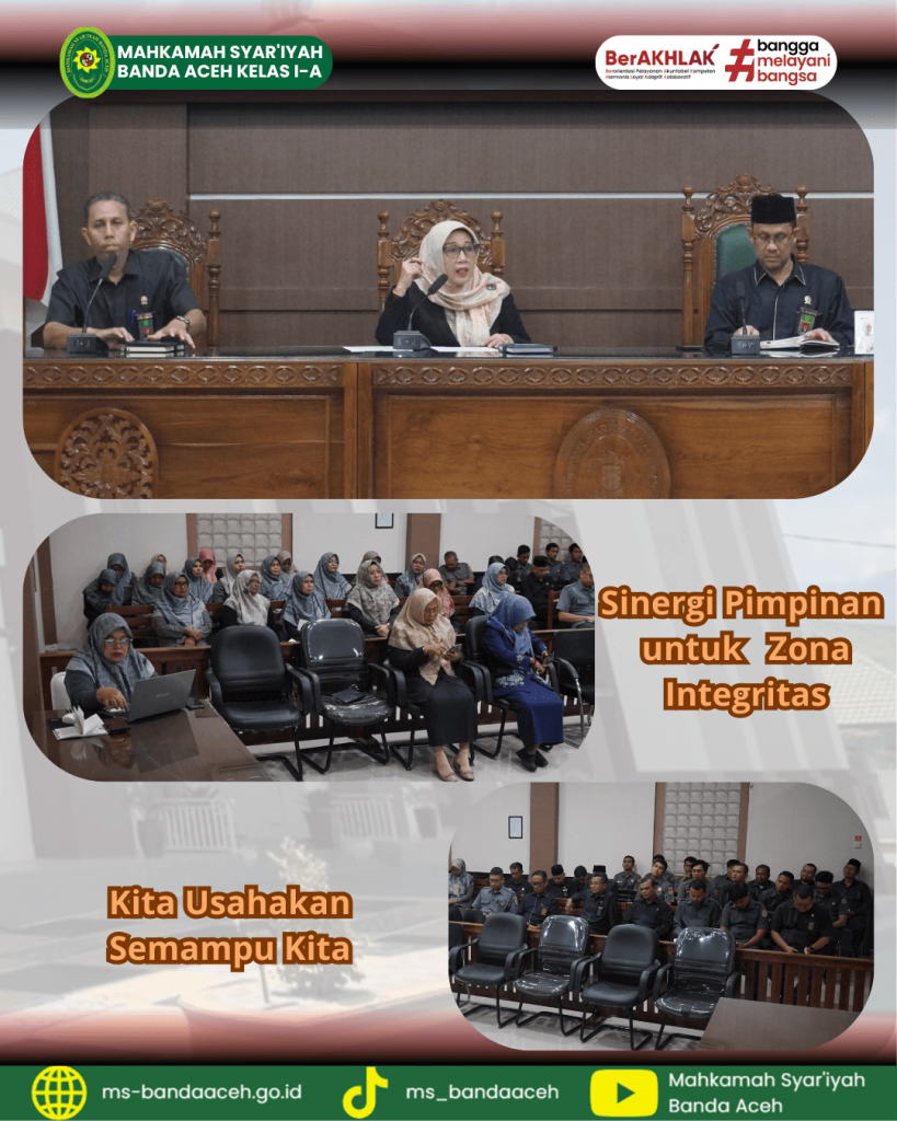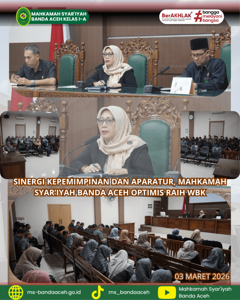 Kolaborasi yang solid antara pimpinan dan seluruh aparatur menjadi fondasi kuat dalam membangun budaya kerja yang profesional dan akuntabel. Melalui pembangunan Zona Integritas, Mahkamah Syar’iyah Banda Aceh menegaskan komitmennya menghadirkan pelayanan hukum yang bersih, amanah, dan semakin dipercaya oleh masyarakat. Mahkamah Syar’iyah Banda Aceh, Melayani dengan Integritas, Mengadili dengan Profesionalitas.(Myq)