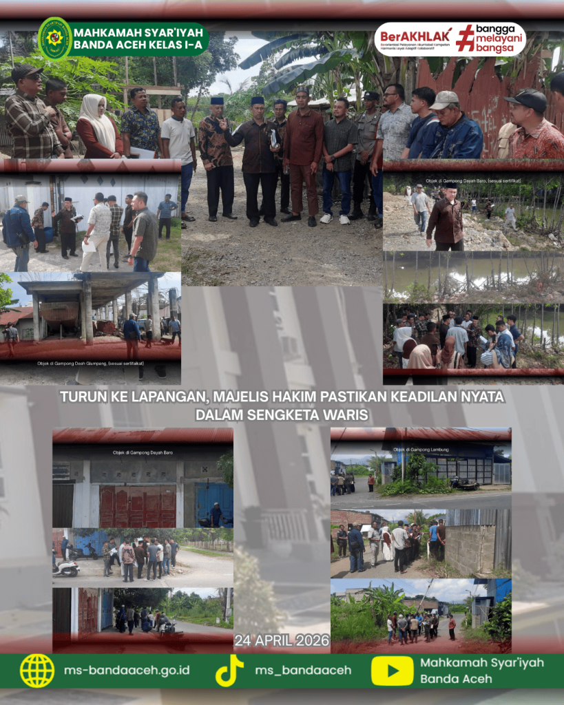 Banda Aceh, Jumat, 24 April 2026 — Kepastian hukum dalam perkara kewarisan merupakan kebutuhan mendasar bagi masyarakat, khususnya yang berkaitan dengan hak kepemilikan dan pembagian harta keluarga. Untuk memastikan keadilan benar-benar dirasakan, proses peradilan tidak hanya dilaksanakan di ruang sidang, tetapi juga menjangkau langsung objek sengketa di lapangan.